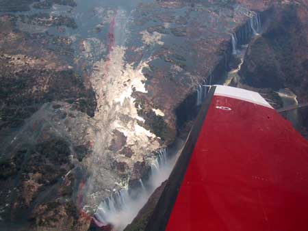 traveling in style, the helicopter landed next to our aircraft. In the rotor-wing we were passengers now it was our turn flying the Malibu over the waterfall. (It's the dry season and the water level is very low)